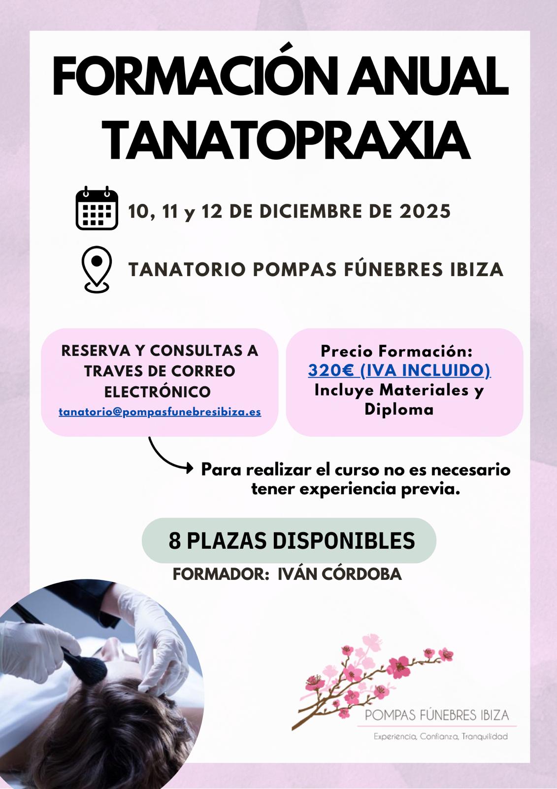 El curso será impartido por Iván Córdoba, responsable del tanatorio y formador nacional titulado en tanatopraxia, con una amplia trayectoria docente en Ibiza. A lo largo de las sesiones se abordarán, entre otros contenidos: